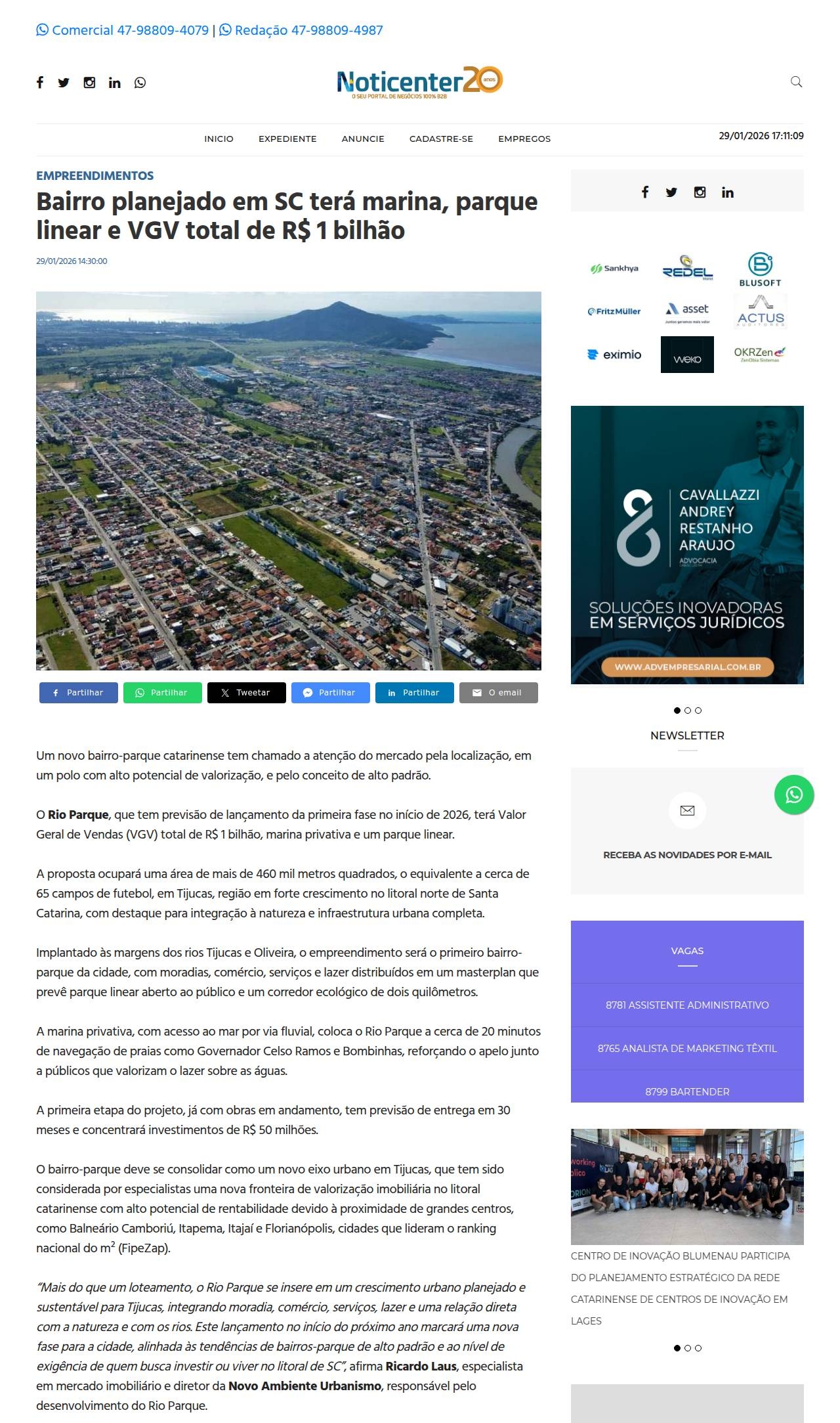Bairro planejado em SC terá marina, parque linear e VGV total de R$ 1 bilhão Noticenter